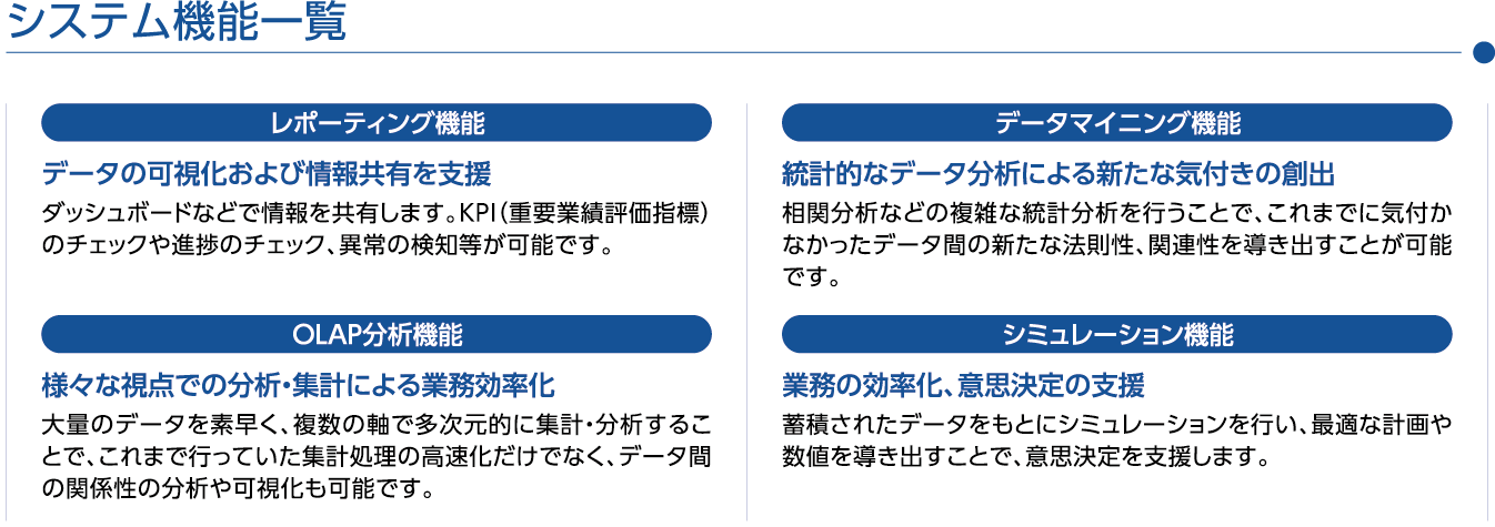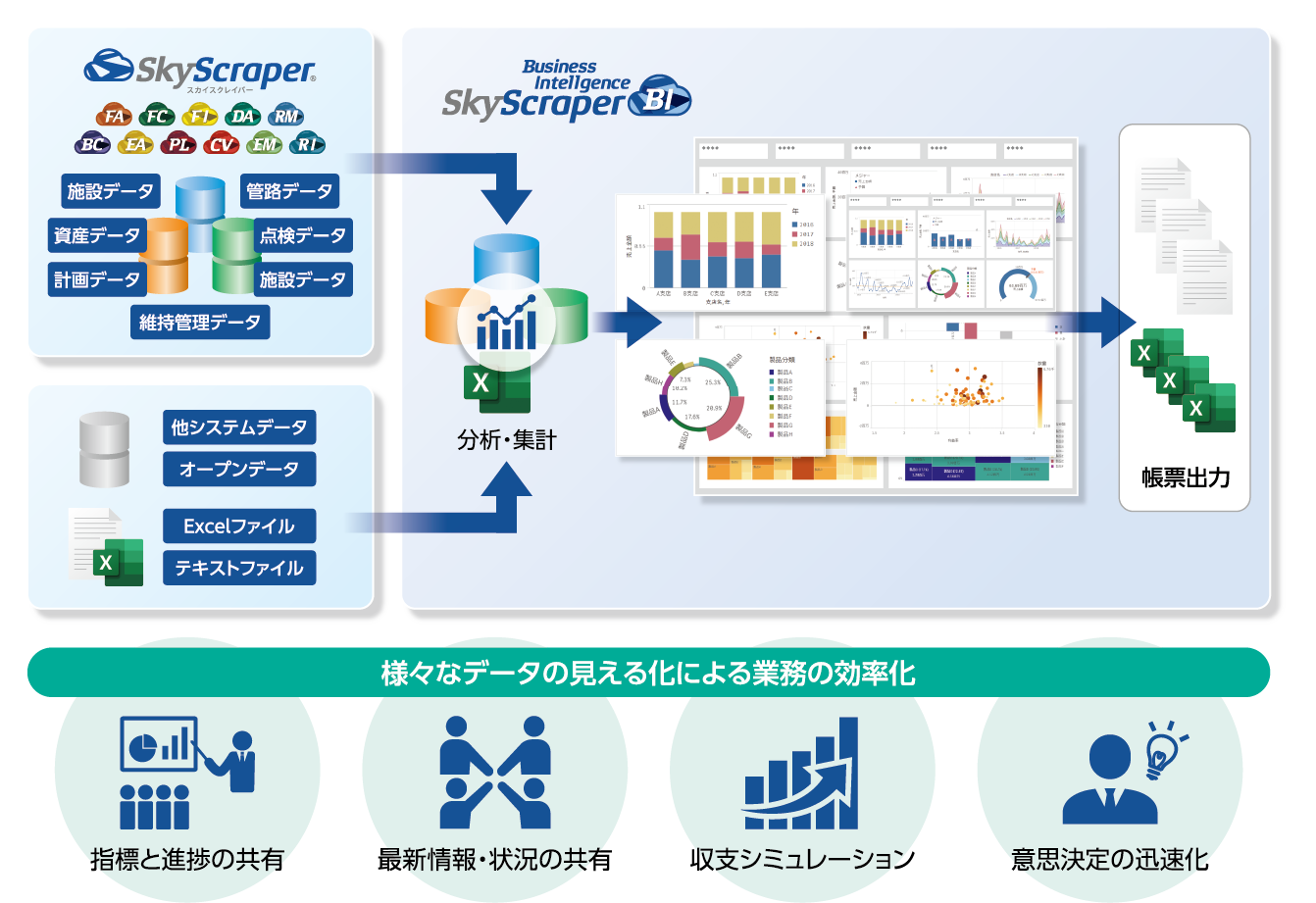 SkyScraperBIは、各アプリケーション等に蓄積された情報を分析・集計し、見える化するシステムです。 直感的な操作でデータを統合、分析、可視化することが可能であり、意思決定に役立つデータ活用を支援 します。SkyScraper製品群のデータベースだけではなく、SkyScraper以外のシステムデータ、Excel データ、テキストデータを統合できるため、多角的な分析を行うことが可能です。