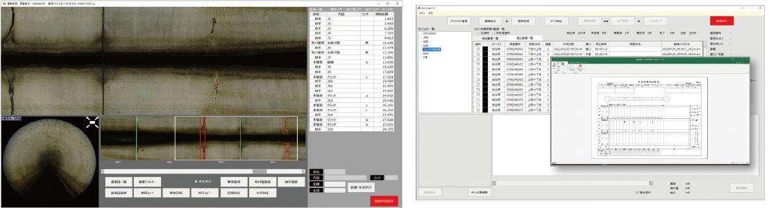 SkyScraper CVは、クラウドサービスの現場側の機能(Windowsアプリケーション)として、下水管路の不具合箇所を画像解析等を用いて高精度に診断するシステムです。 調査用TVカメラ車、ドローン(AirSlider)により撮影された超広角カメラの映像を基に画像解析し、管路の劣化状態を診断することが可能です。 不具合箇所の診断を強力にサポートし、これまで見落としていた異常箇所の特定を支援します。 クラウド管路台帳(SkyScraper PL -WEBGIS)との連携により、劣化予測など管路の見える化を推進し、管路マネジメントを総合的に支援します。