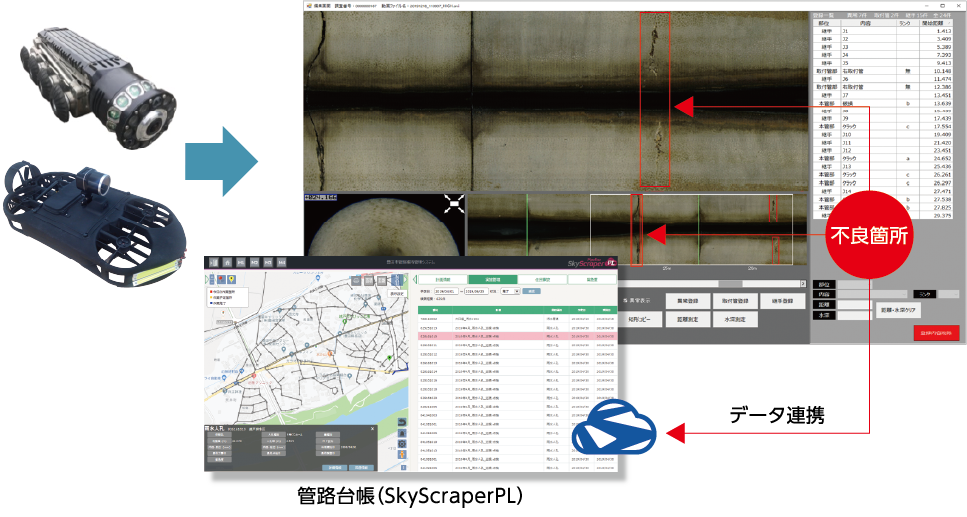 SkyScraperCVは、クラウドサービスの現場側の機能(Windowsアプリケーション)として、下水管路の 不具合箇所を画像解析等を用いて高精度に診断するシステムです。 調査用TVカメラ車、ドローン(AirSlider®)により撮影された超広角カメラの映像を基に、画像解析し管路 の劣化状態の診断が可能です。 不具合箇所の診断を強力にサポートし、これまで 見落としていた異常箇所の特定を支援します。 異常箇所は、クラウド管路台帳(SkyScraperPL -WEBGIS)との連携により、劣化予測など管 路の見える化を推進し、管路マネジメントを総 合的に支援します。