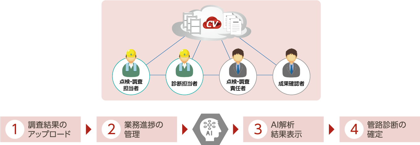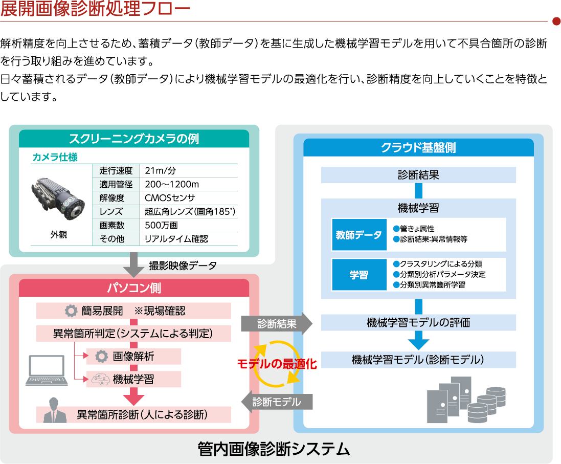 SkyScraperCV-WEBは、下水管路調査データの管理、独自の画像解析AIによる管内異常診断、調査記録 表等の帳票出力が可能なクラウドシステムです。調査用TVカメラ車、ドローン、管口カメラ等により撮影さ れた広角カメラの映像・画像を基に、不具合箇所をAI解析し管内の劣化診断を行います。不具合箇所の診 断を強力にサポートし、これまで見落としていた 異常箇所の特定を支援します。 異常箇所は、管路台帳と連携し、劣化予測など 管路の見える化を推進し、管路マネジメントを 総合的に支援します。また、調査業務の進捗状況、 調査診断結果等を関係者間でリアルタイムに情報 共有可能となり、調査業務のDXを支援します。