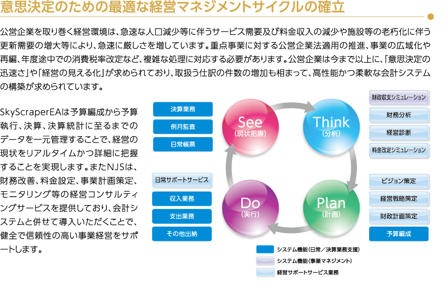 SkyScraperEA(公営企業会計システム)は、総務省による「公営企業会計の適用の推進」 の要請を受け、公営 企業会計へ新たに移行されるお客様向け機能のラインナップを充実させるとともに、「お客様の業務負担の 軽減」や「会計事務の信頼性・安定性」を重視して開発しました。オリジナル版は販売開始から15年を迎え、 多くのお客様から好評をいただいておりますが、全国のお客様から寄せられた声と、会計コンサルタント としての経験とノウハウを凝縮させ、“使いやすさ”を徹底的に追求した新バージョンをリリースしました。