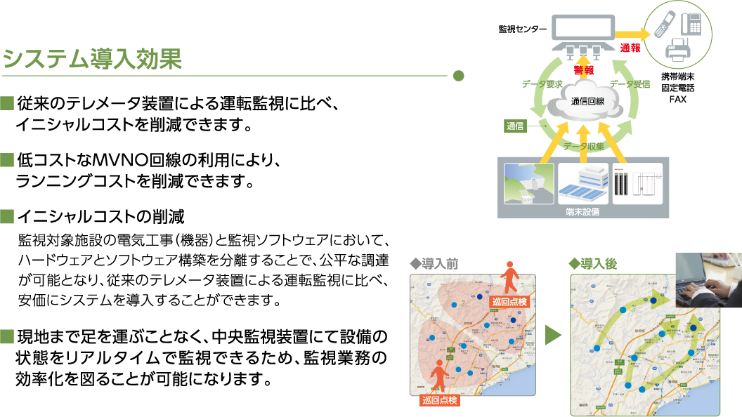 SkyScraperEM(運転監視システム)は、リアルタイムに設備の状態を遠方監視できるシステムです。 各所に点在する浄水場や配水施設の巡回点検に替わり、常時、各施設の運転状況や不正侵入等による異常を 監視センターで検知できるようになるため、監視レベルの強化ならびに点検に係る省力化を図ることが可能 になります。