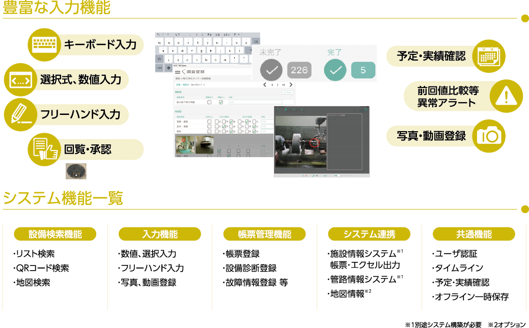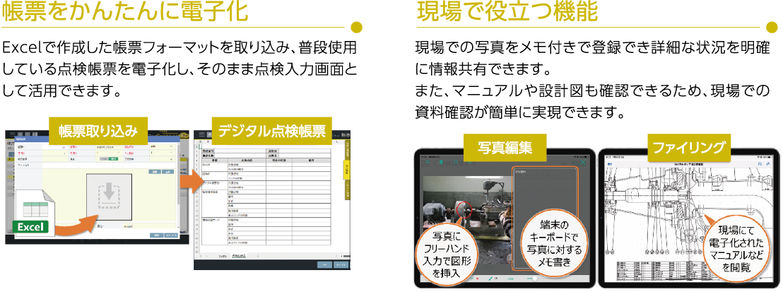SkyScraperFI(現場点検支援システム)は、紙の点検帳票を簡単に電子化することが でき、タブレット端末専用アプリを使って設備の日常点検等を行うことが可能です。 紙の点検帳票では気づきにくい前回結果との比較や閾値異常のアラート機能に加え、 マニュアル等の関連図書の参照が可能なので、生産性向上が期待できます。電波が 届きにくい場所の点検でも、オフライン対応が可能です。 オンライン時に、点検結果をクラウド保存するため、災害発生時においても関係者間の 情報共有が速やかに行えます。