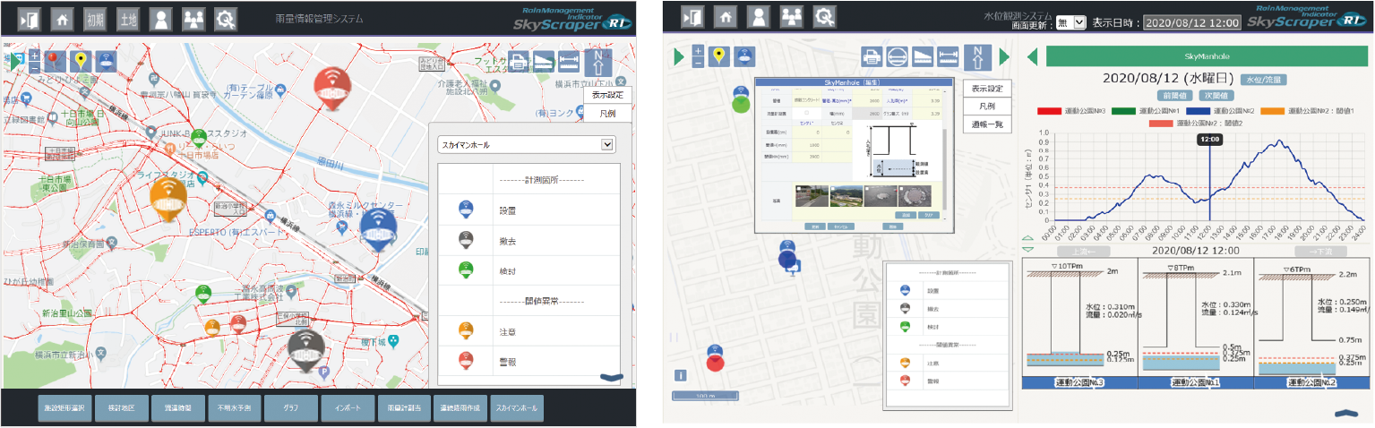 SkyScraper RI(水位観測システム)は、管内水位データをリアルタイムに提供するシステムです。各種関連システム(SkyScraper RM、 SkyScraper ML)との連携により、高度な浸水対策の支援機能として活用が可能です。 雨量観測データや河川等の水位観測データ、 浸水対策施設の運転データを集約・加工することにより、豪雨時の浸水被害軽減、下水道施設の効果的運用および迅速な警戒態勢の構築を支援します。