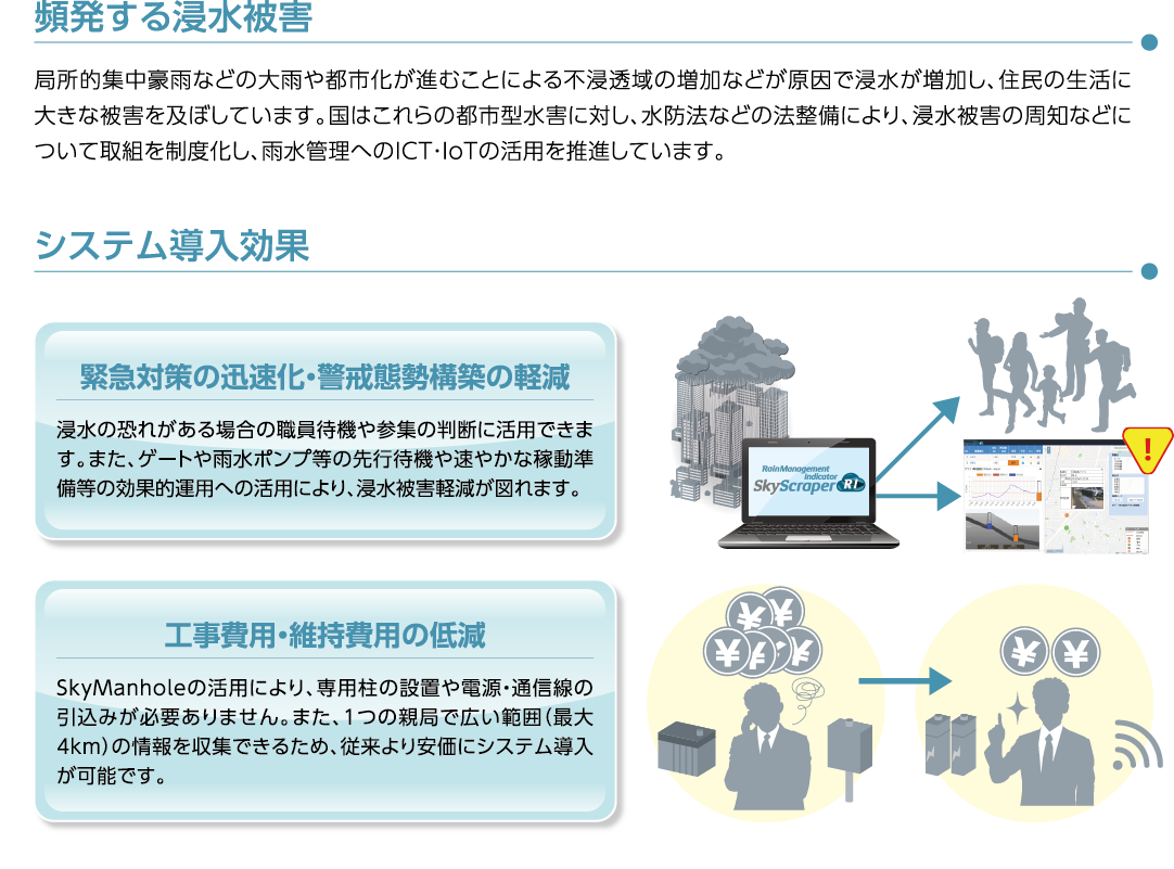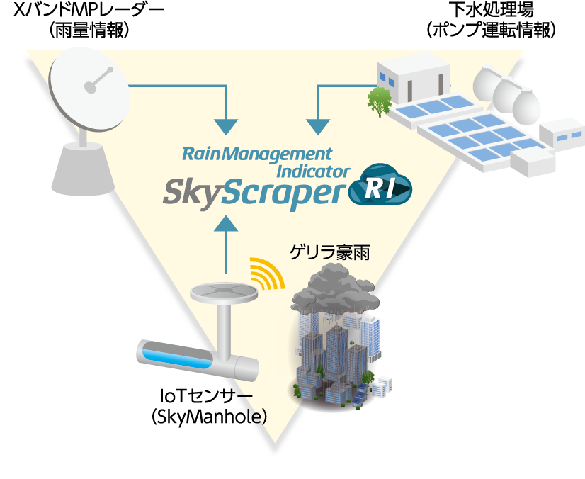 SkyScraperRI(水位観測システム)は、管内 水位をリアルタイムに提供するシステムで す。各種関連システム(SkyScraperRM、 SkyScraperML)との連携により、高度な浸 水対策の支援機能として活用が可能です。 雨量観測データや河川等水位観測データ、 浸水対策施設の運転データを集約・加工する ことにより、豪雨時の浸水被害軽減、下水道 施設の効果的運用及び迅速な警戒態勢の 構築を支援します。